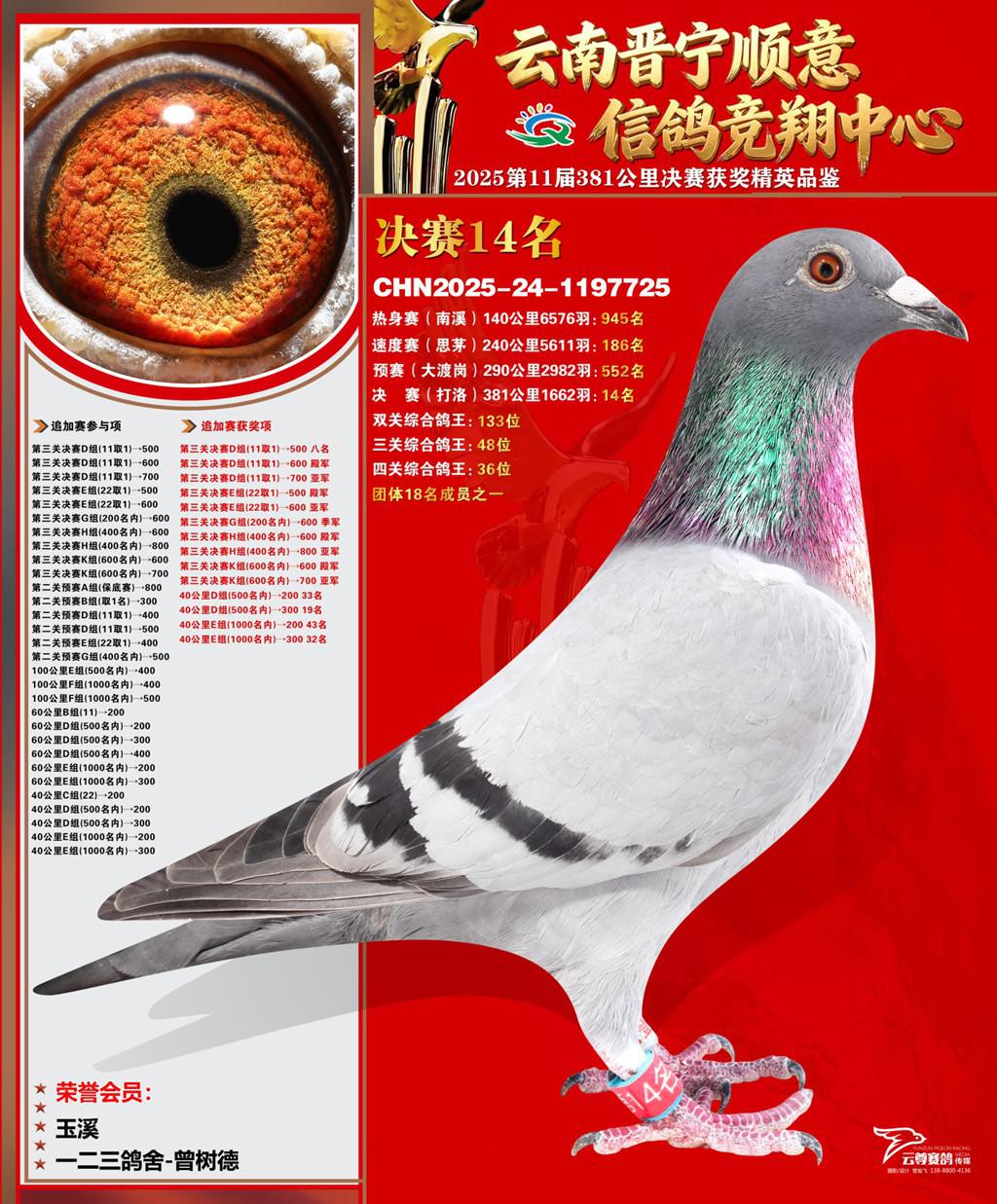 位置:云南晋宁顺意信鸽竞翔中心2025获奖鸽展示\决赛14名